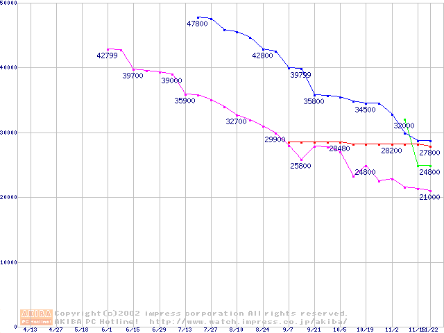 | [↓次グラフ]: | 2.5インチHDD主要製品(最安値3万円以上)の最安値推移 |