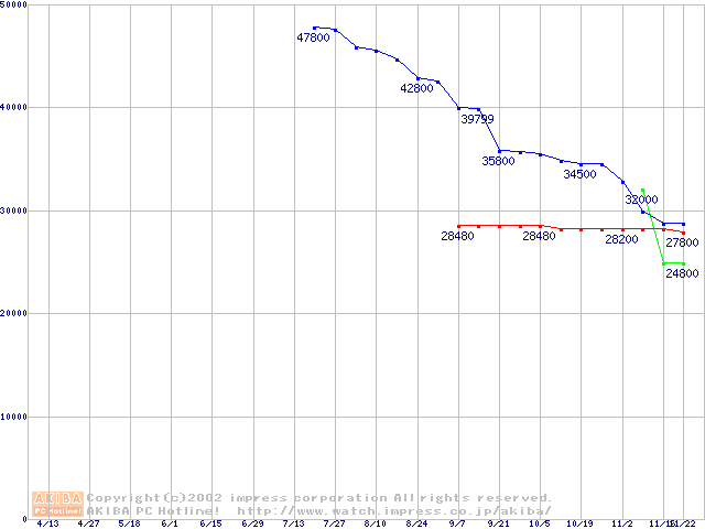 | [↑前グラフ]: | 2.5インチHDD 40GB~50GB未満(9.5mm厚,5400rpm)の最安値推移 |