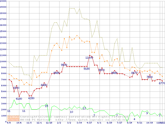 PC133 SDRAM DIMM CasLatency=3 ECC対応 Registeredタイプの最安値推移