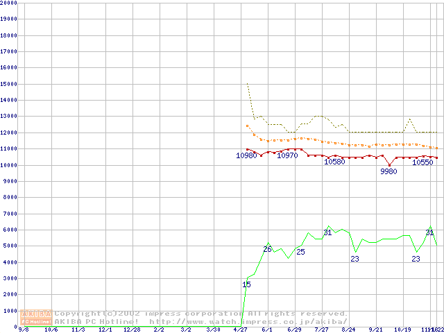 メモリ主要製品(最安値1万円以上)の最安値推移
