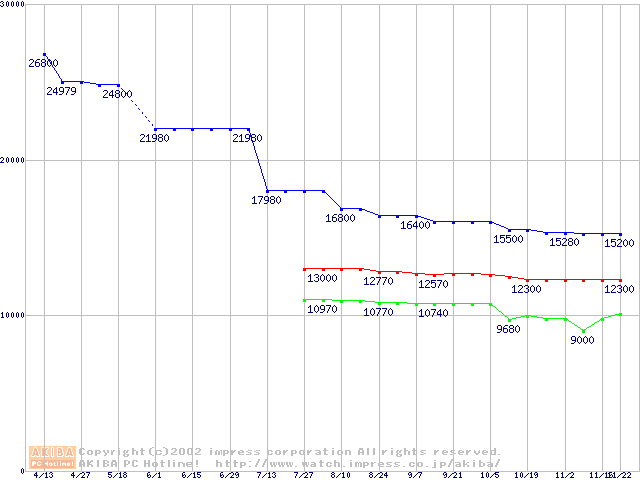 | [↑前グラフ]: | DK23EAシリーズ (9.5mm,4200rpm,2MB,FDB,30GB/Platter)の最安値推移 |