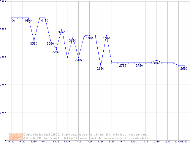 | [↑前グラフ]: | Socket A (PGA,FSB 200MHz,L2 64KB,Spitfire)の最安値推移 |