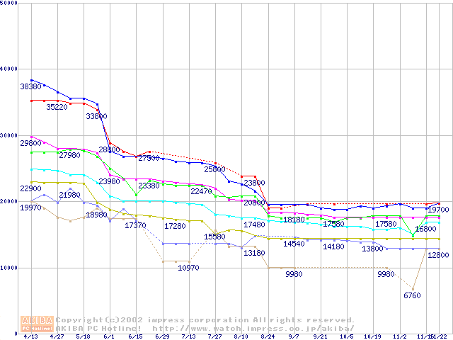 | [↑前グラフ]: | Socket A (OPGA,FSB 266MHz,L2 256KB,Thoroughbred)の最安値推移 |