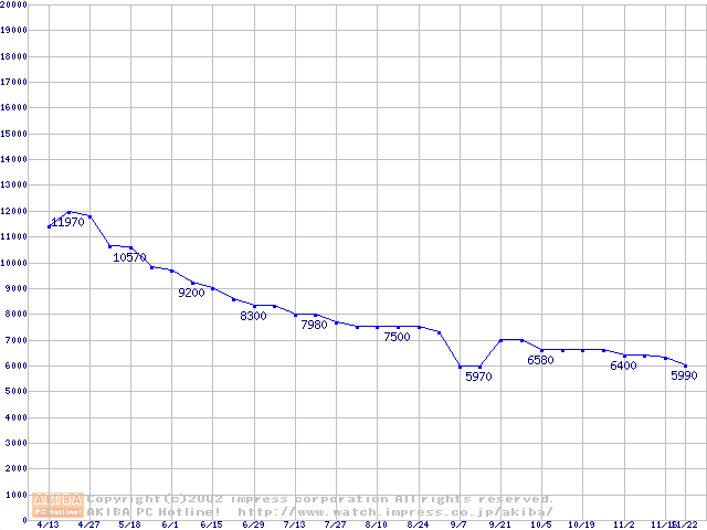 | Socket A (PGA,FSB 266MHz,L2 256KB,Thunderbird)の最安値推移 |