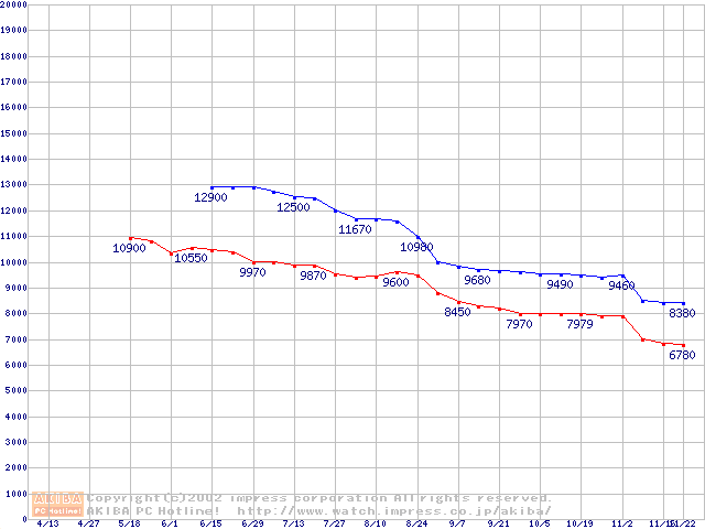 | [↓次グラフ]: | Socket 370 (FC-PGA2,FSB 100MHz,L2 256KB,Tualatin)の最安値推移 |