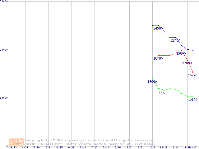 | [↑前グラフ]: | Deskstar 180GXP (7200rpm,8MB,UltraATA/100,FDB)の最安値推移 |