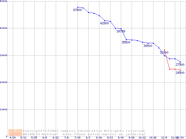 | [↑前グラフ]: | 2.5インチHDD 40GB~50GB未満(9.5mm厚,5400rpm)の最安値推移 |