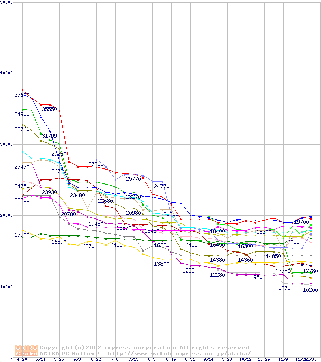 CPU主要製品(最安値1万円~2万円未満)の最安値推移