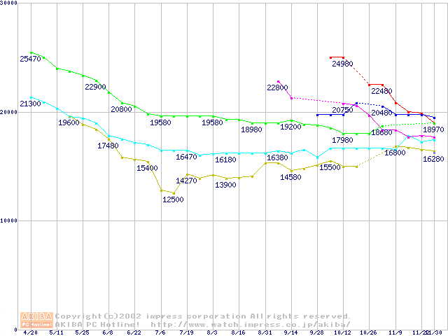 | [↓次グラフ]: | HDD主要製品(最安値2万円以上)の最安値推移 |
