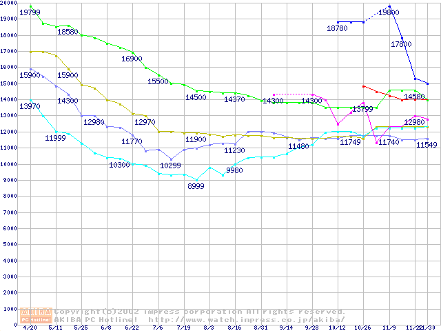 | [↑前グラフ]: | HDD 60GB~80GB未満(7200rpmクラス)の最安値推移 |
