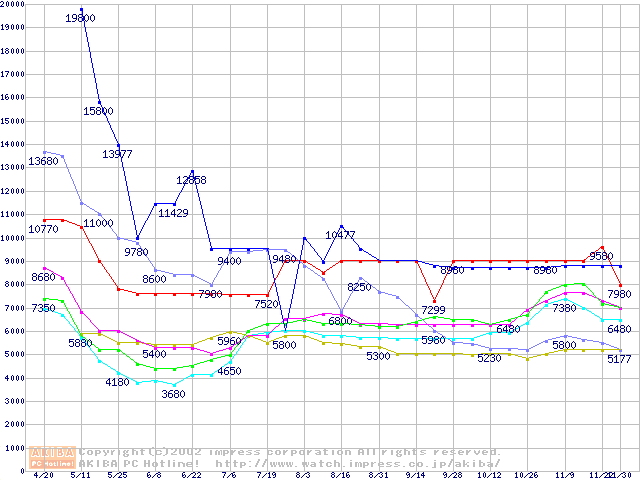 メモリ主要製品(最安値1万円以上)の最安値推移