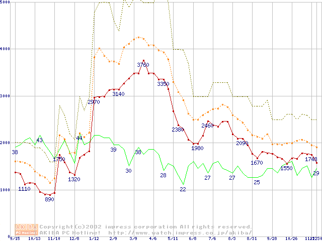 PC100 SDRAM DIMM CasLatency=2の最安値推移