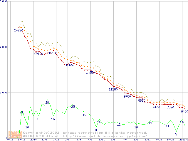 Socket A (OPGA,FSB 266MHz,L2 256KB,Palomino)の最安値推移