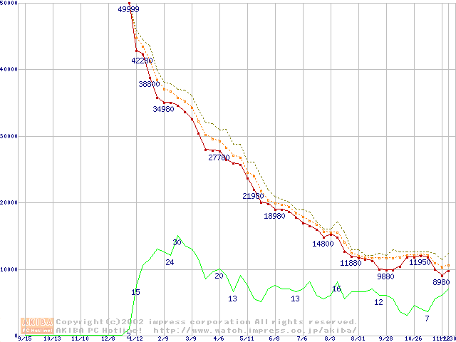 Socket A (OPGA,FSB 266MHz,L2 256KB,Palomino)の最安値推移