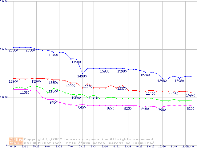 | [↑前グラフ]: | MHSシリーズ (9.5mm,4200rpm,UltraATA/100,2MB,FDB,30GB/Platter,FDB)の最安値推移 |