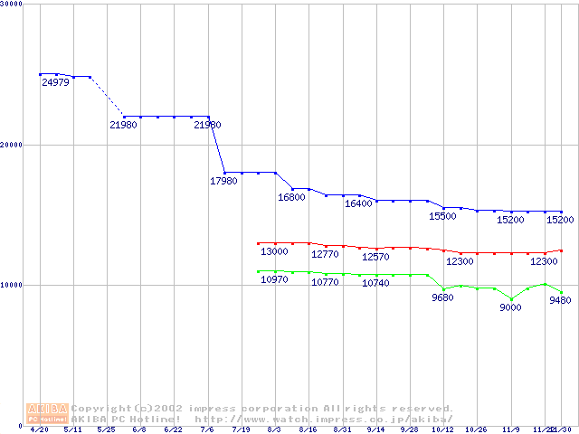 | [↑前グラフ]: | DK23EAシリーズ (9.5mm,4200rpm,2MB,FDB,30GB/Platter)の最安値推移 |