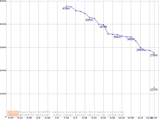 | [↑前グラフ]: | MKシリーズ (9.5mm,5400rpm,16MB,FDB,20GB/Platter)の最安値推移 |