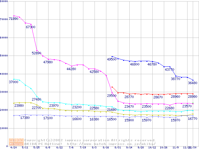 | [↑前グラフ]: | Socket 478 (micro-PGA,FSB 533MHz,L2 512KB,Northwood)の最安値推移 |