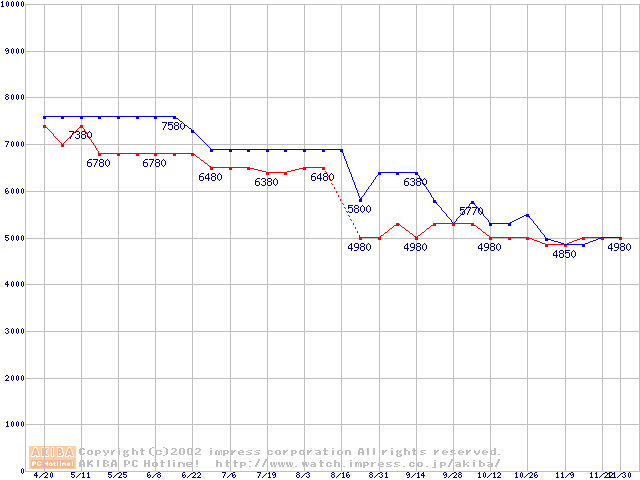 | [↓次グラフ]: | Deskstar 180GXP (7200rpm,8MB,UltraATA/100,FDB)の最安値推移 |