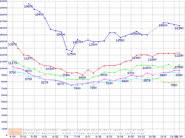 | [↑前グラフ]: | Deskstar 180GXP (7200rpm,2MB,UltraATA/100,FDB)の最安値推移 |