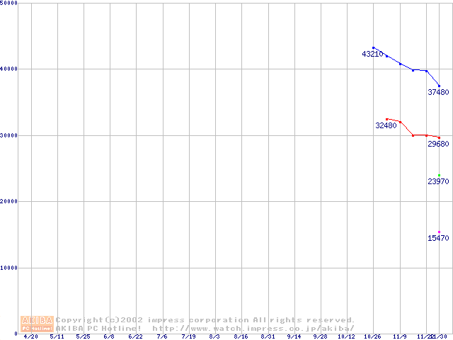 | [↑前グラフ]: | Deskstar 120GXP (7200rpm,2MB,UltraATA/100,BB)の最安値推移 |
