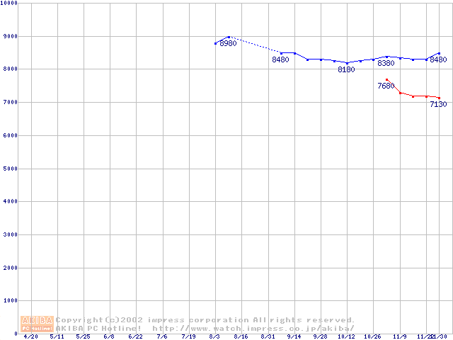 | [↑前グラフ]: | DiamondMax D540X-4K (5400rpm,UltraATA/100,40GB/Platter)の最安値推移 |