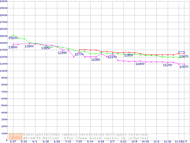 | [↑前グラフ]: | 2.5インチHDD 20GB~30GB未満(9.5mm厚)の最安値推移 |
