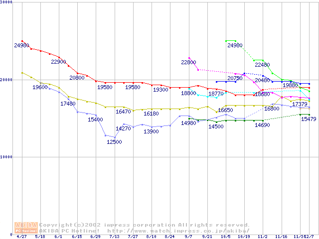 HDD主要製品(最安値1万5千円~2万円未満)の最安値推移
