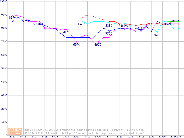 | [↑前グラフ]: | HDD 30GB~40GB未満(5400rpmクラス)の最安値推移 |