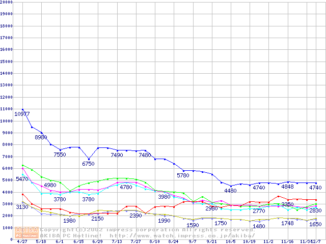 メモリ主要製品(最安値5千円未満)の最安値推移