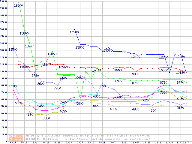 メモリ主要製品(最安値1万円以上)の最安値推移