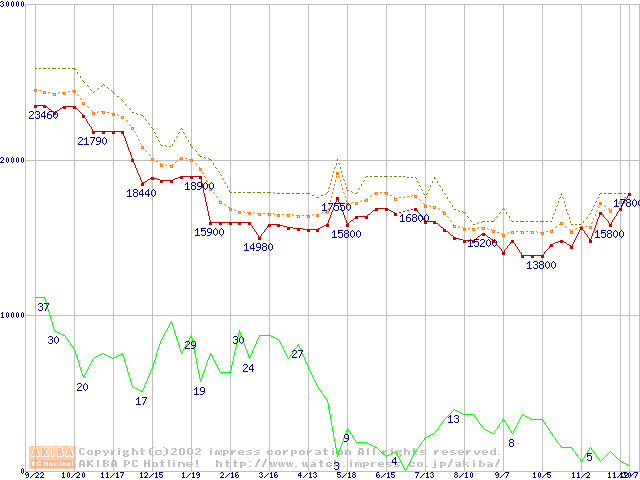 Socket 370 (FC-PGA,FSB 133MHz,L2 256KB)の最安値推移
