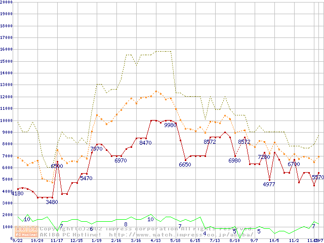 PC100 SDRAM DIMM CasLatency=2 ECC対応の最安値推移