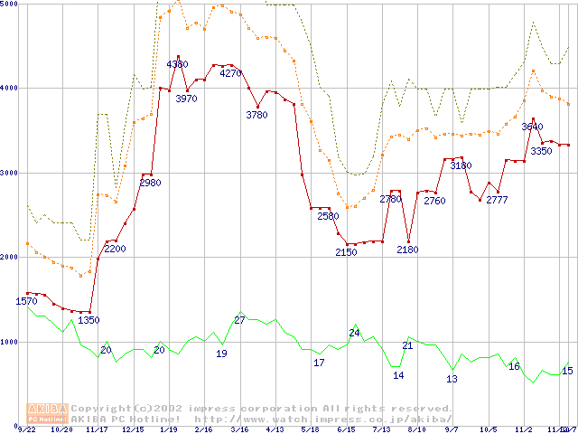 メモリ主要製品(最安値5千円未満)の最安値推移