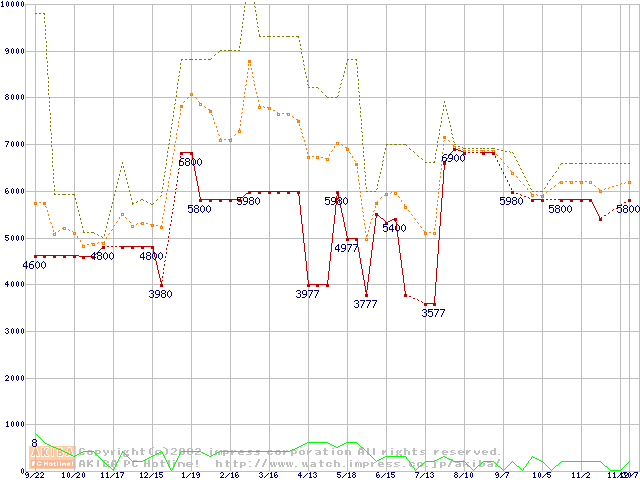 PC133 SDRAM DIMM CasLatency=3 ECC対応 Registeredタイプの最安値推移