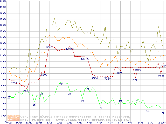 PC2100(DDR266) DDR SDRAM DIMM ECC対応 Registeredタイプの最安値推移