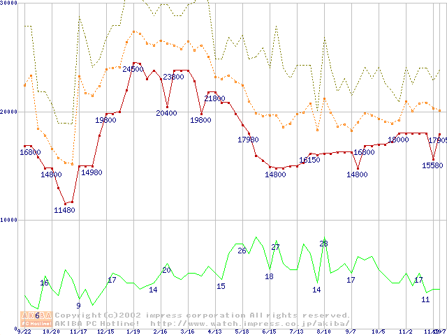PC2100(DDR266) DDR SDRAM DIMM ECC対応 Registeredタイプの最安値推移