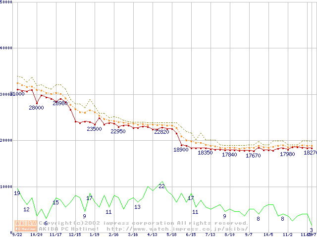 Socket 370 (FC-PGA2,FSB 133MHz,L2 512KB)の最安値推移