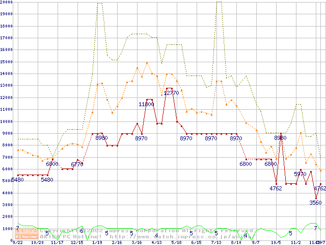 PC100 SDRAM DIMM CasLatency=2 ECC対応 Registeredタイプの最安値推移