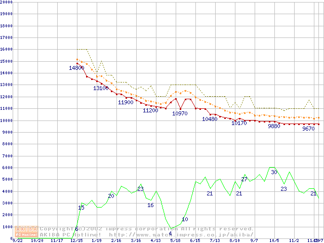 Travelstar 40GN (9.5mm,4200rpm,UltraATA/100,2MB,FDB,20GB/Platter)の最安値推移