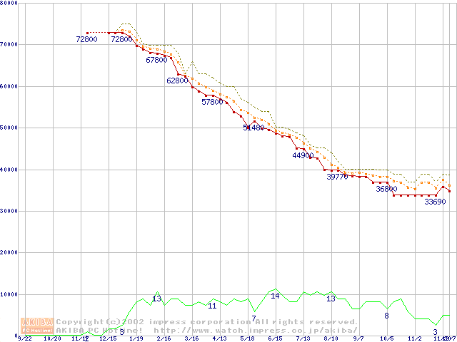 2.5インチHDD主要製品(最安値3万円以上)の最安値推移