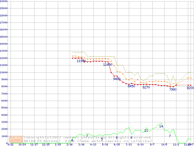 MHRシリーズ (9.5mm,4200rpm,UltraATA/100,2MB,FDB,20GB/Platter)の最安値推移
