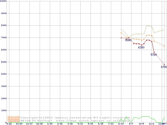 Socket 370 (FC-PGA,FSB 100MHz,L2 128KB,Coppermine)の最安値推移
