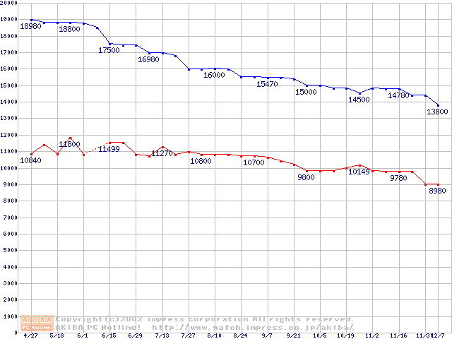 | [↑前グラフ]: | MKシリーズ (9.5mm,4200rpm,2MB,FDB,20GB/Platter)の最安値推移 |