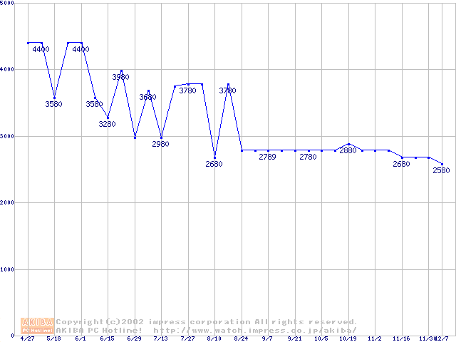 | [↑前グラフ]: | Socket A (PGA,FSB 200MHz,L2 64KB,Spitfire)の最安値推移 |