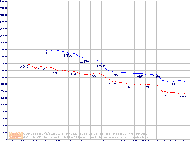 | [↓次グラフ]: | Socket 370 (FC-PGA2,FSB 100MHz,L2 256KB,Tualatin)の最安値推移 |