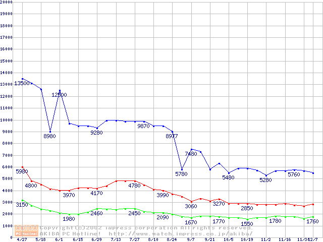 | [↓次グラフ]: | PC100 SDRAM DIMM CasLatency=2 ECC対応の最安値推移 |