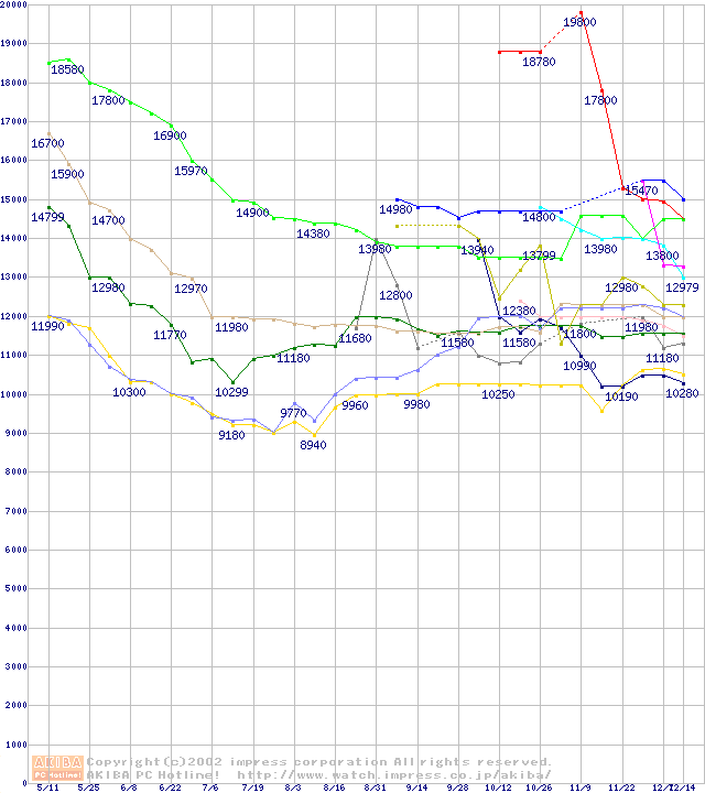 HDD主要製品(最安値1万5千円~2万円未満)の最安値推移