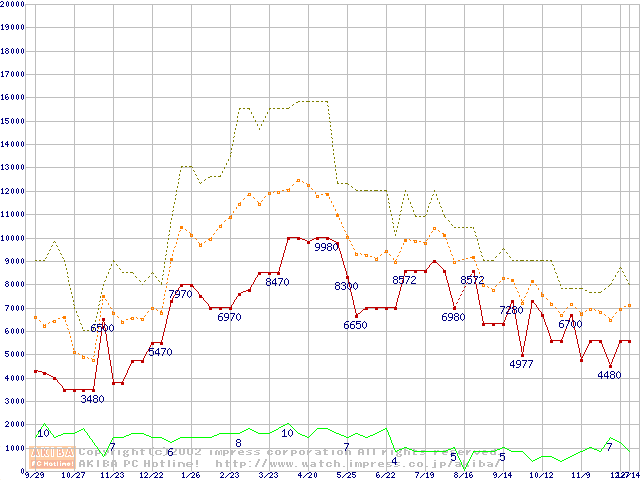 PC100 SDRAM DIMM CasLatency=2 ECC対応の最安値推移