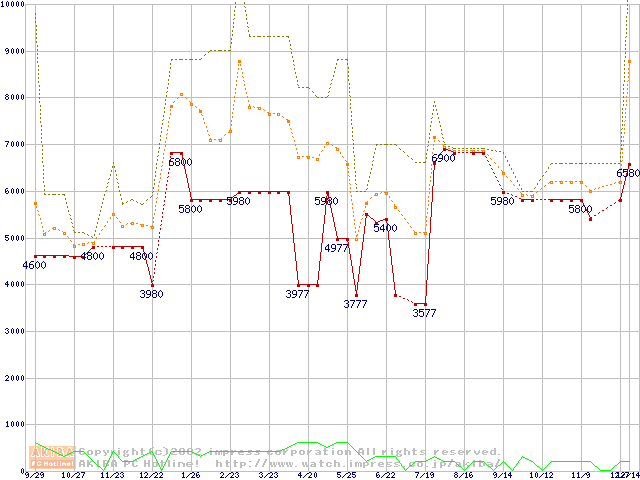 PC133 SDRAM DIMM CasLatency=3 ECC対応 Registeredタイプの最安値推移